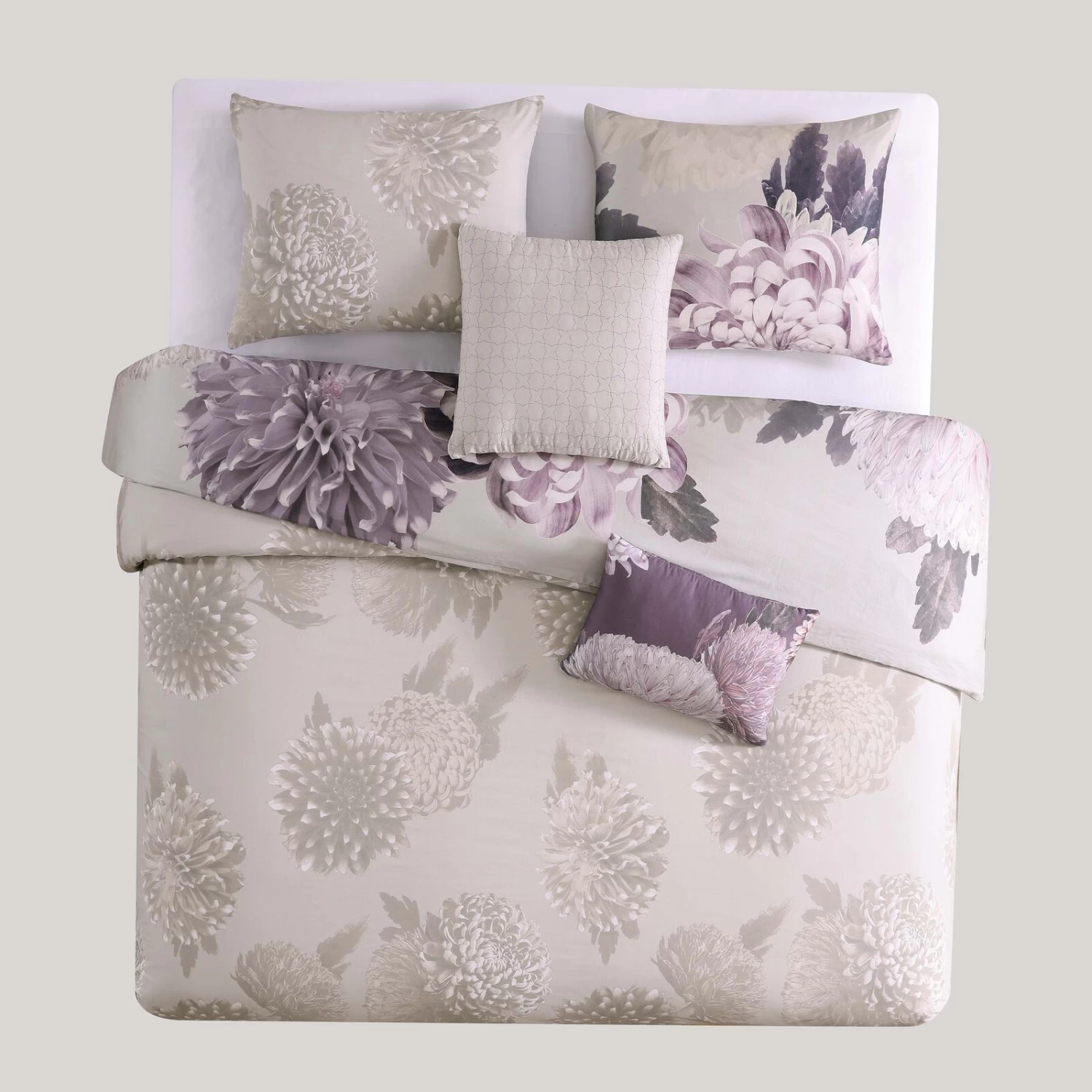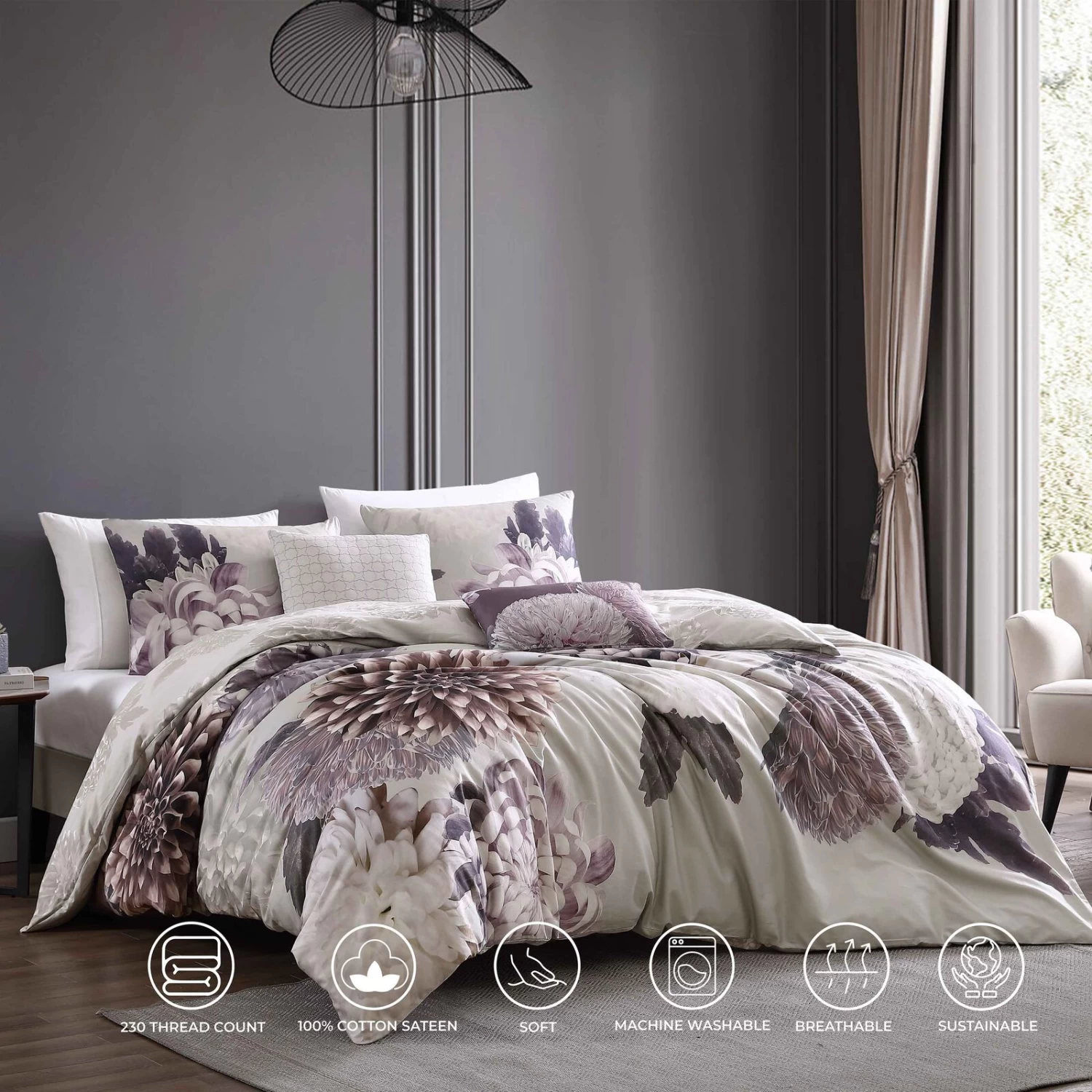 shades of plum and amethyst come to life on the bloom 5 pc comforter sets bold, enlarged floral print, while on the reverse side, a more subdued neutral version of the print tones down the effect. The versatility of this soft 100% cotton sateen reversible comforter makes it at home in any style of room. The 5 piece set includes a reversible comforter, 2 reversible shams with embroidered and printed decorative pillows.