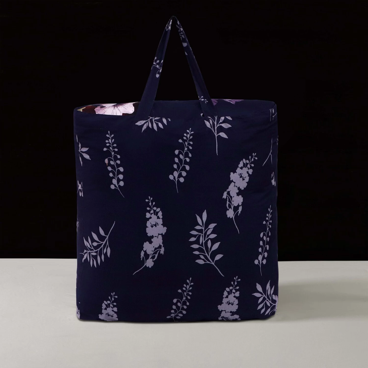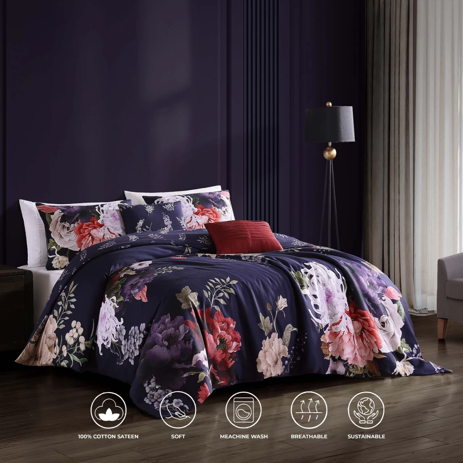 A deep, rich eggplant purple background sets the stage for a lively bouquet of large, bursting flowers on the Purple Garden 5 piece reversible comforter set. The sophisticated and appealing color palette of this grand flower garden print will enhance any bedroom, while on the other side, a tone-on-tone leaf pattern provides a calm second look. The 18×18ā pillow simulates the tonal leaf pattern of the reverse, but adds embroidery. The 2 shams and 12×18ā pillow, all included, are printed and the entire set is made from a luxurious 100% cotton sateen. As a bonus, the set is packaged in a reusable self-fabric tote.