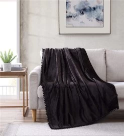 Walnut Flannel Pompom 50″ X 70″ Throw Black