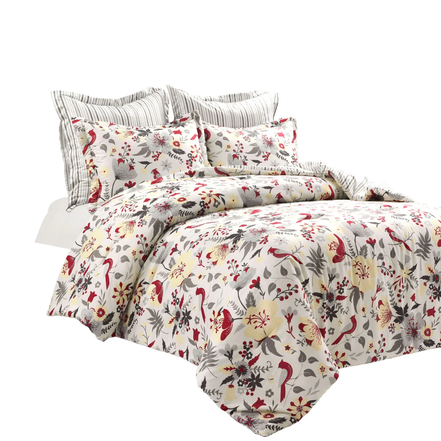 The classic patterns of birds and blossoming flowers on this reversible comforter set convey a traditionally inviting farmhouse feel. This five piece set is soft to the touch and unveils a collection of soft stripes on the reverse side.