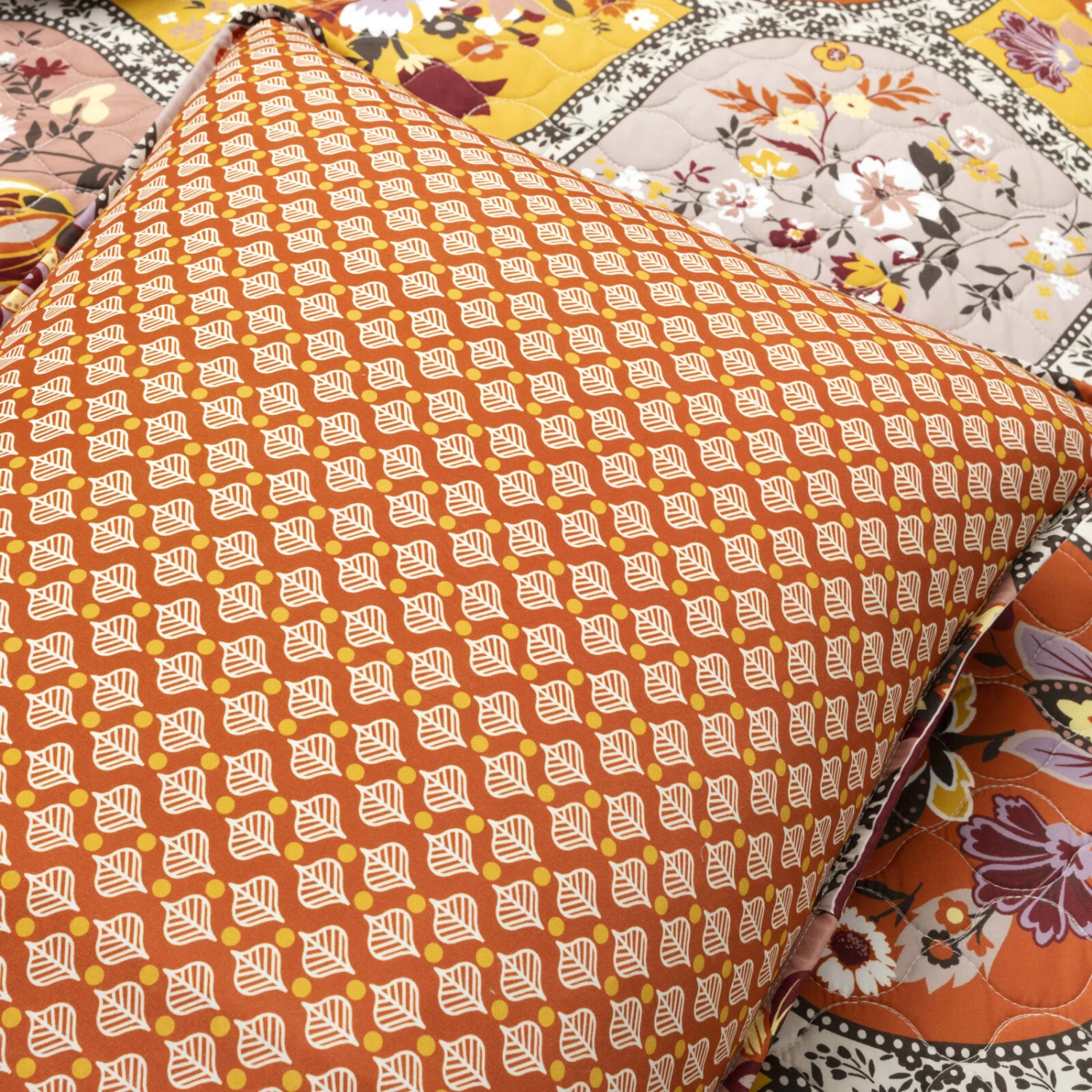 This reversible quilt set is the addition every cottagecore bedroom needs. This floral boho quilt set dresses your bedroom with familiar patterns and lively shades. Printed on lightweight breathable cotton, this bedding is oversized for your year round comfort. And when you want to change things up, simply flip it over to the graphic leaf inspired design on the reverse. Texture is brought to the quilt and two matching shams with the stitched onion quilting pattern. This product is STANDARD 100 by OEKO-TEX® certified, which means the fabric, dyes and all components have been tested in an independent laboratory and certified against a list of more than 350 harmful substances. Machine washable for your convenience. Please refer to label for full care instructions for best results.