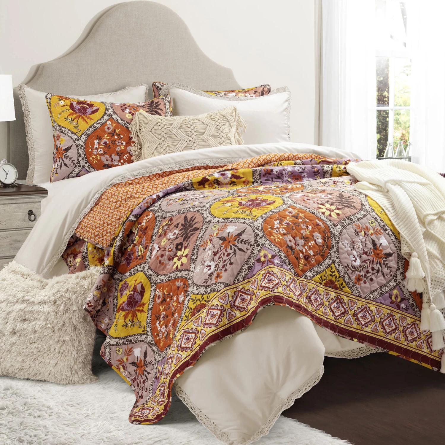 Bohemian Flower Reversible Oversized Cotton Quilt 3Pc Set