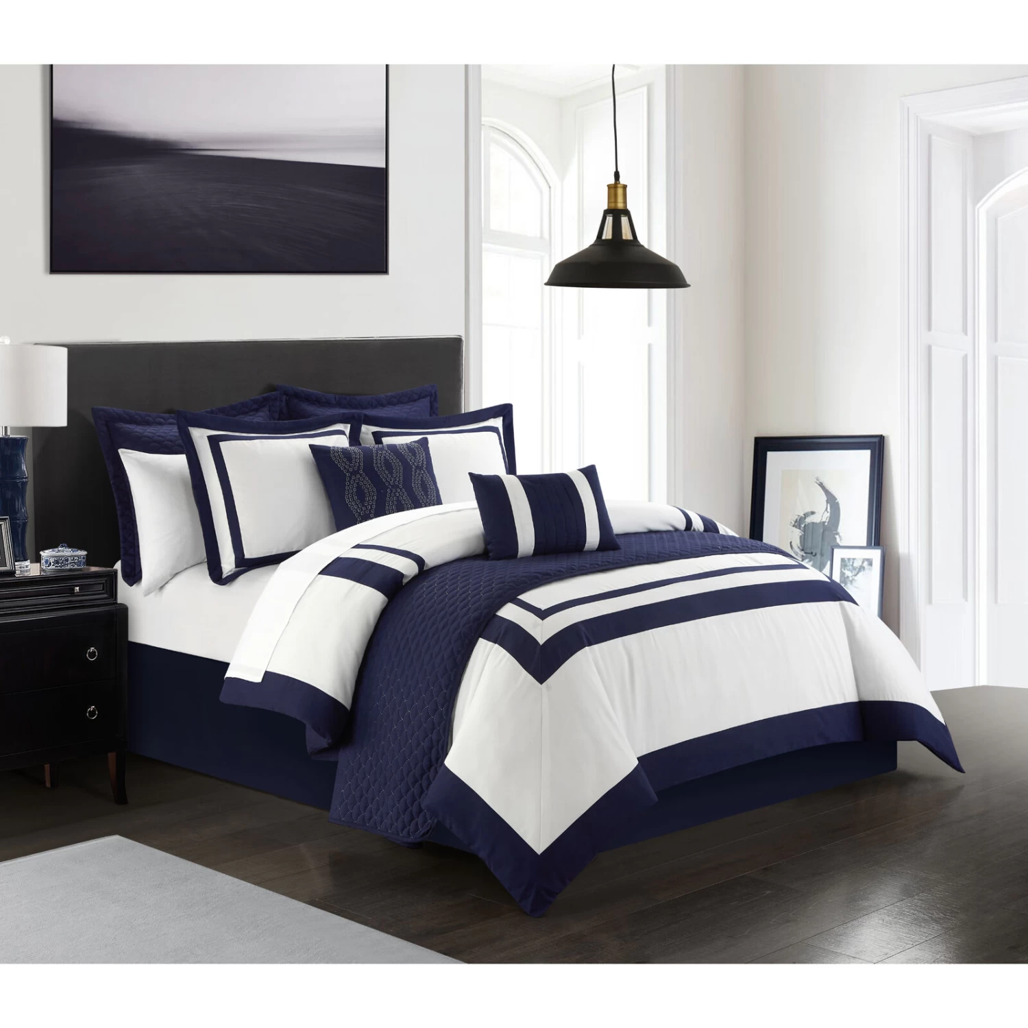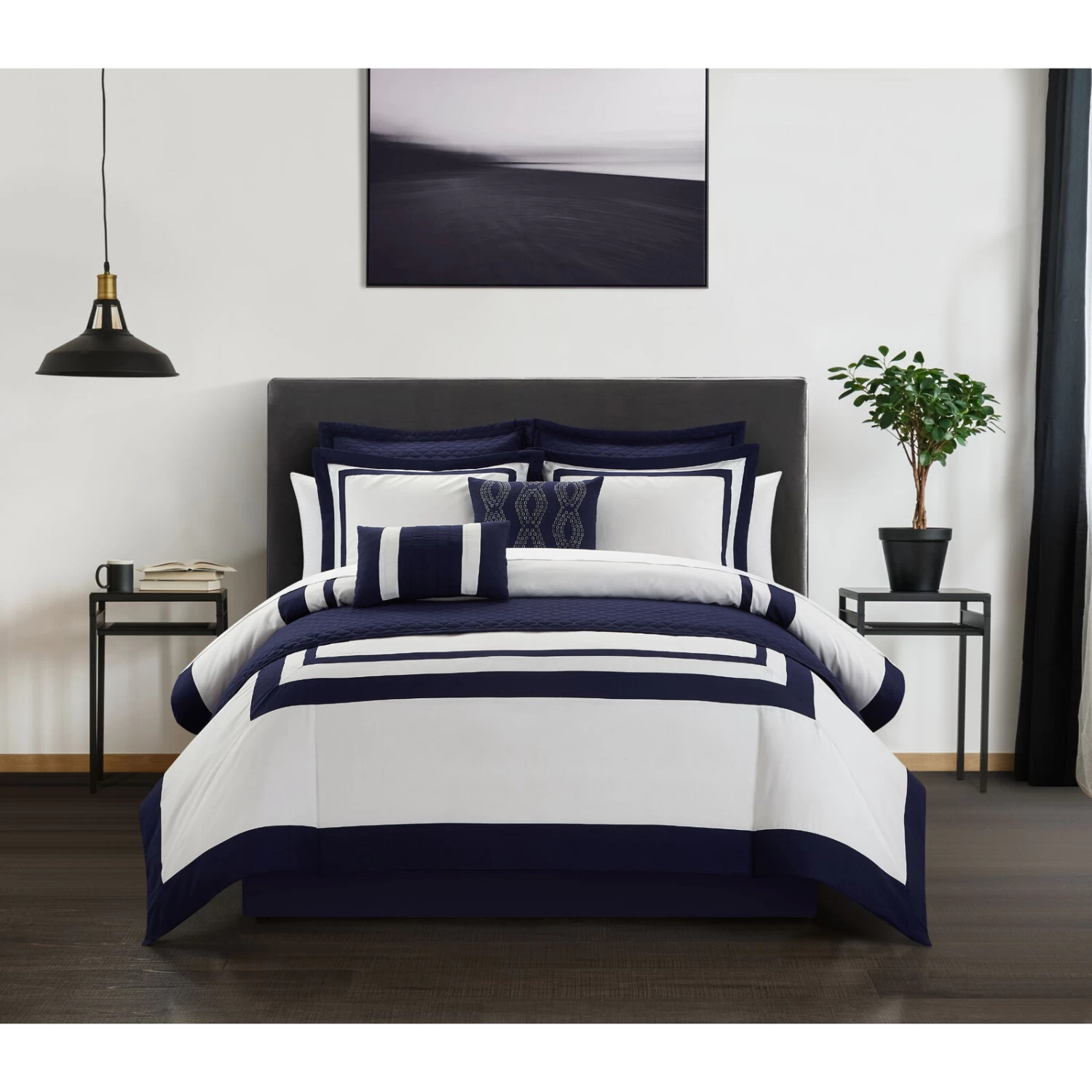 Give your bedroom a bold new look with the unique style of the Hortense comforter and quilt set from Chic Home. This set includes a stylish two-tone hotel collection design comforter and a fish scale pattern quilt, giving you the freedom to mix and match as you please. Two unique decorative pillows and design coordinated shams complete the look. A sheet and pillowcase set is included. Available Size Queen. Color Navy.