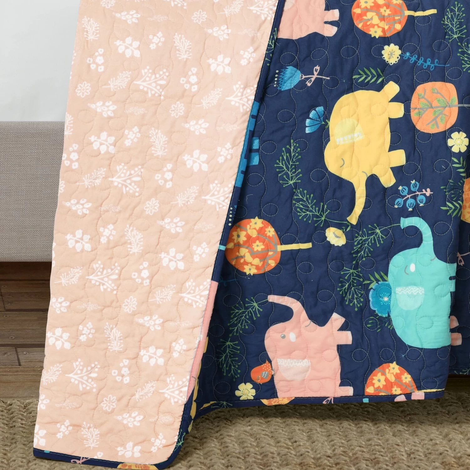 Elephants symbolize strength, honor, patience, luck, fortune, and protection. Decorate your child’s first big kid bedroom with this reversible quilt set featuring an adorable pattern of playful, colorful elephants frolicking among the trees.