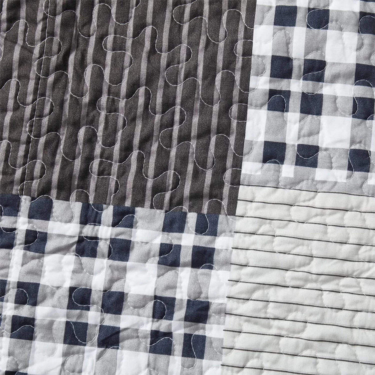 This quilt has beautiful reversible grey and white patchwork patterns. 3 Piece sets include one oversized bedspread and two shams. The ensemble offers a variety of expertly crafted details that complete the relaxed presentation. These bedspreads are made with 100% high quality ultra-soft microfiber and are machine washable on gentle cycle in cold water for easy cleaning and maintenance. Tumble dry on low. Match curtains are available sold separately. NOTE Colors may be slightly brighter or slightly darker, depending on the resolution of your monitor! Bedspread depicted here is for demonstrative purposes only. Actual bedspread may or may not touch the floor depending on the mattress’s thickness (height) and the height of bed frame/railing.