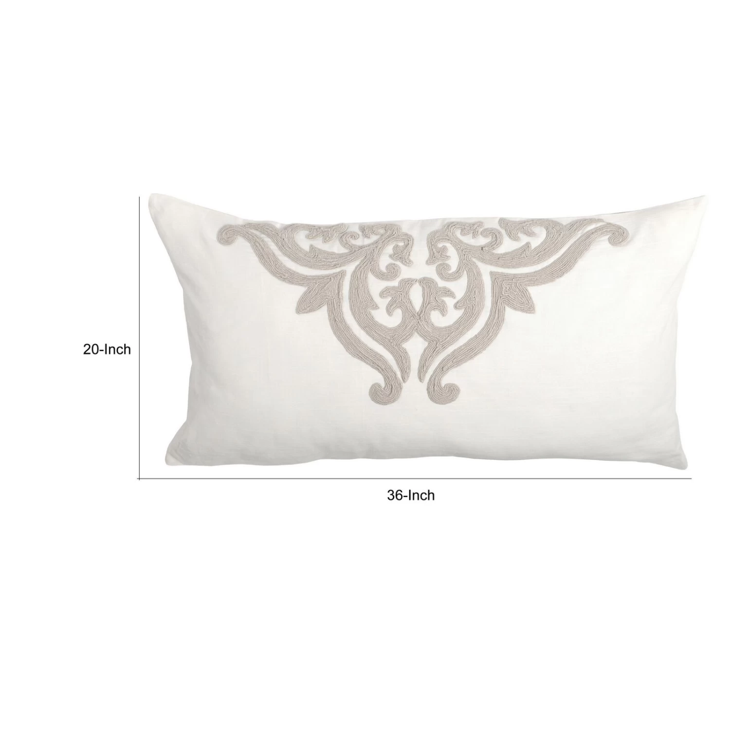 Lenz 20 X 36 Lumbar King Pillow Sham, Hand Stitched Ivory Damask Embroidery-Benzara