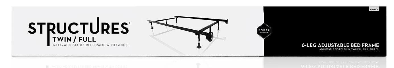 The Malouf Twin/Full Adjustable Bed Frame provides lasting support for Twin, Twin XL, Full, and Full XL beds. Solid steel construction and our Tri-Support™ system creates optimal leg support. Frame rests on four reinforced glides or 2.5-inch in-line rug rollers with two locking wheels. Frame width adjusts between 38 inches and 53 inches with a length of 70 inches.