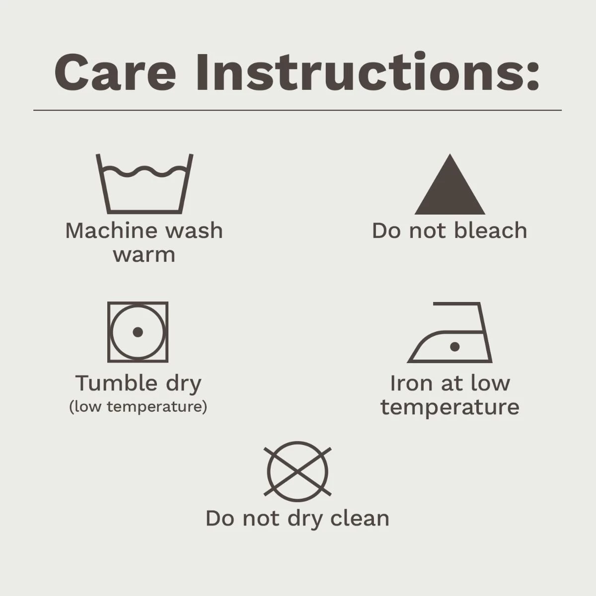 - Machine wash warm, no bleach, tumble dry low, low heat iron, do not dry clean.