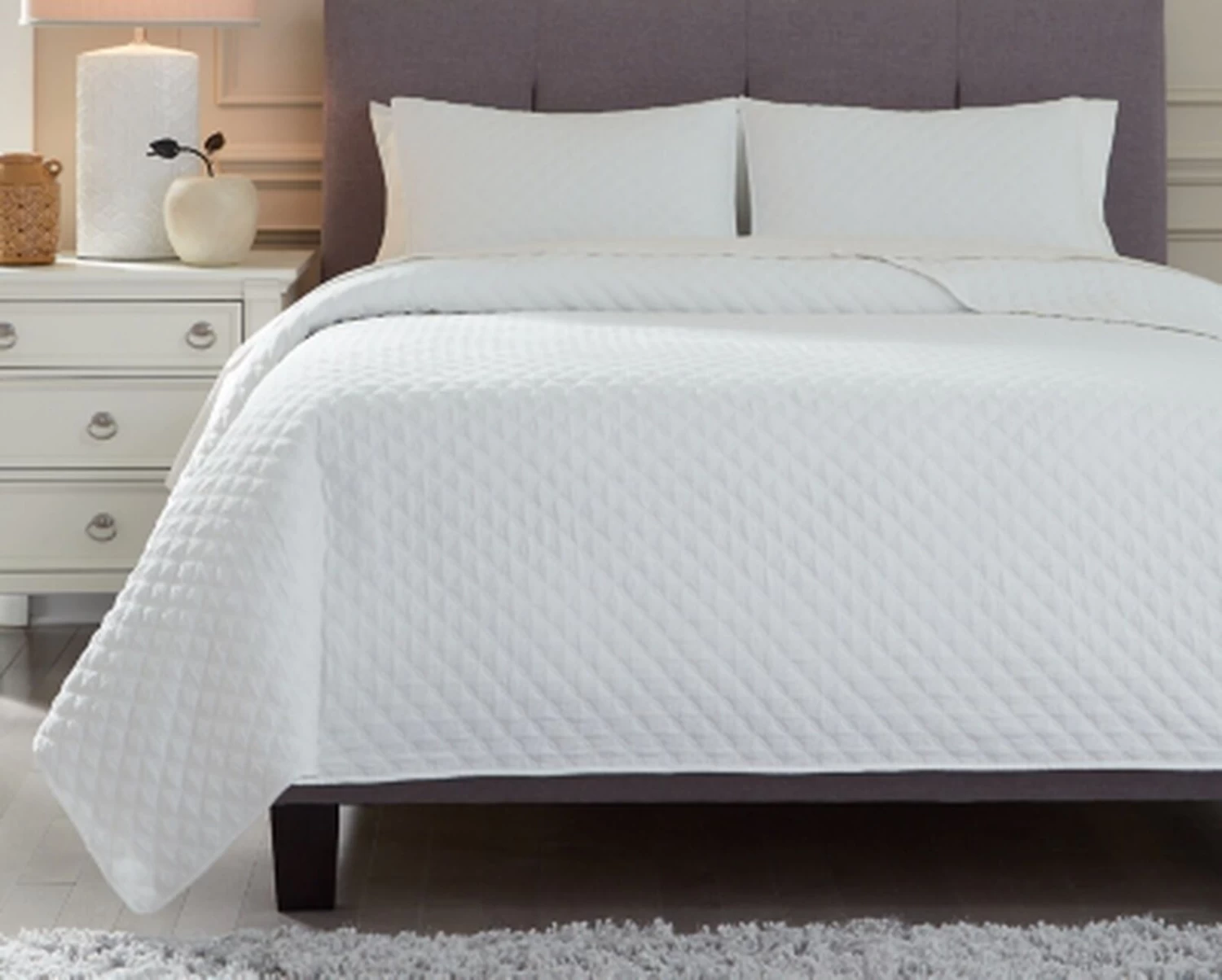 Reminiscent of the classic wedding ring quilt pattern, this coverlet set conveys a sweet sense of vintage style in a thoroughly modern way. The quilted diamond design repeats across the breadth of the delightfully neutral color.