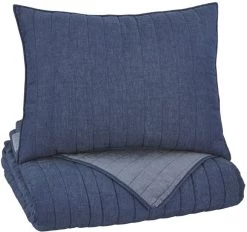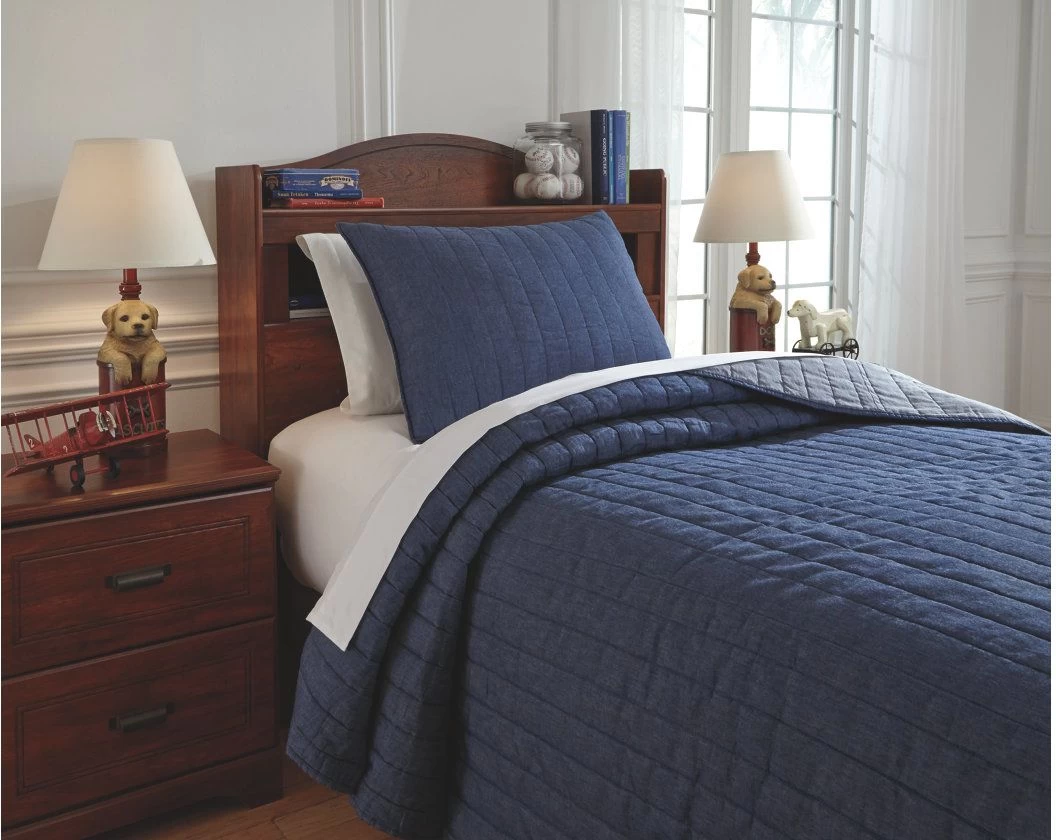 Sporting a gently washed-out denim hue, this quilt set is right in tune with their maturing tastes. Stitching’s imperfect alignment exudes a relaxed sensibility. For more than 70 years, we’ve set out to prove furniture can be made a better way. We design and craft timeless styles that are comfortable and livable. For our guests, living the American dream is as affordable as it is priceless. Our exclusive furniture and accessories start with a sketch inspired by the design team’s travels around the world. Many Ashley products are assembled in the U.S. with domestic and imported parts, and quality tested so they arrive in your home, ready to enjoy for years. We recognize one style does not suit all. That’s why you’ll find so much to love in our wide selection of room-to-room furnishings. From industrial electric to rustic farmhouse, discover on-trend styles made for mixing and standing out. Material Contents Polyester: 35% Cotton: 65% Clean Code – Wash for Washable Machine wash separately in cold water, gentle cycle with mild detergent. Do not use bleach. Tumble dry at low setting or line dry. *Twin Quilt Set Only. Other Components Not Included.