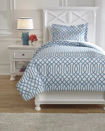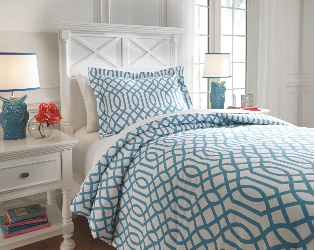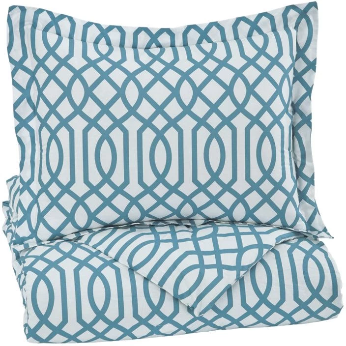 Loaded with high-style twists and turns, this comforter set is the essence of fresh, fun, youthful style. Modern trellis design is right at home with your tween or teen’s fashion sense. 2-3 Piece Comforter Set – Includes Comforter and 2 Shams (1 for Twin). Geometric Design in Aqua. Cotton Cover with Polyester Filling. 200 TC. Machine Washable. For more than 70 years, we’ve set out to prove furniture can be made a better way. We design and craft timeless styles that are comfortable and livable. For our guests, living the American dream is as affordable as it is priceless. Our exclusive furniture and accessories start with a sketch inspired by the design team’s travels around the world. Many Ashley products are assembled in the U.S. with domestic and imported parts, and quality tested so they arrive in your home, ready to enjoy for years. We recognize one style does not suit all. That’s why you’ll find so much to love in our wide selection of room-to-room furnishings. From industrial electric to rustic farmhouse, discover on-trend styles made for mixing and standing out. Clean Code – Wash for Washable. Machine wash separately in cold water, gentle cycle with mild detergent. Do not use bleach. Tumble dry at low setting or line dry. *Comforter set only, other items shown sold separately.