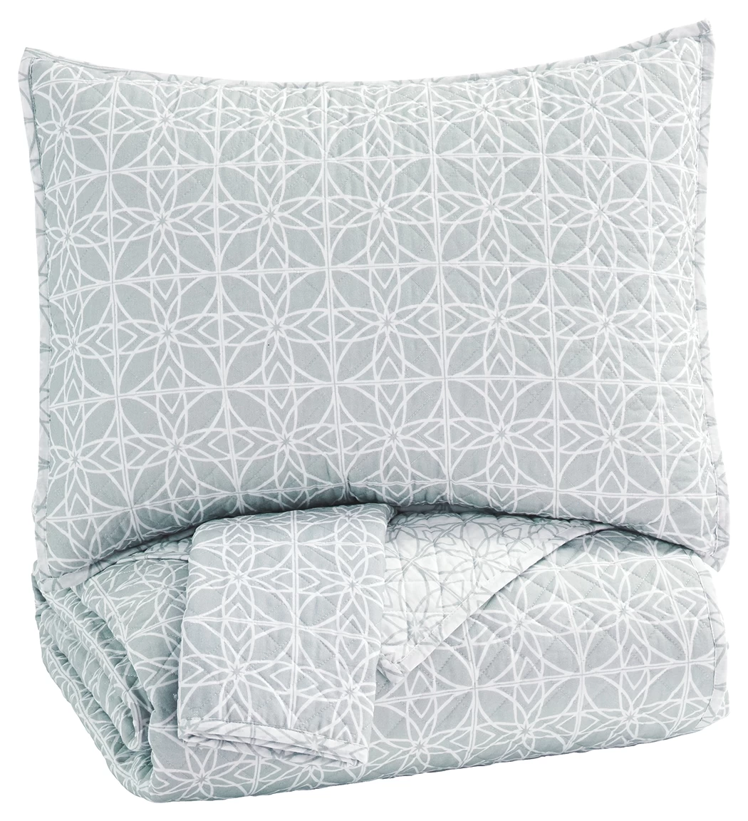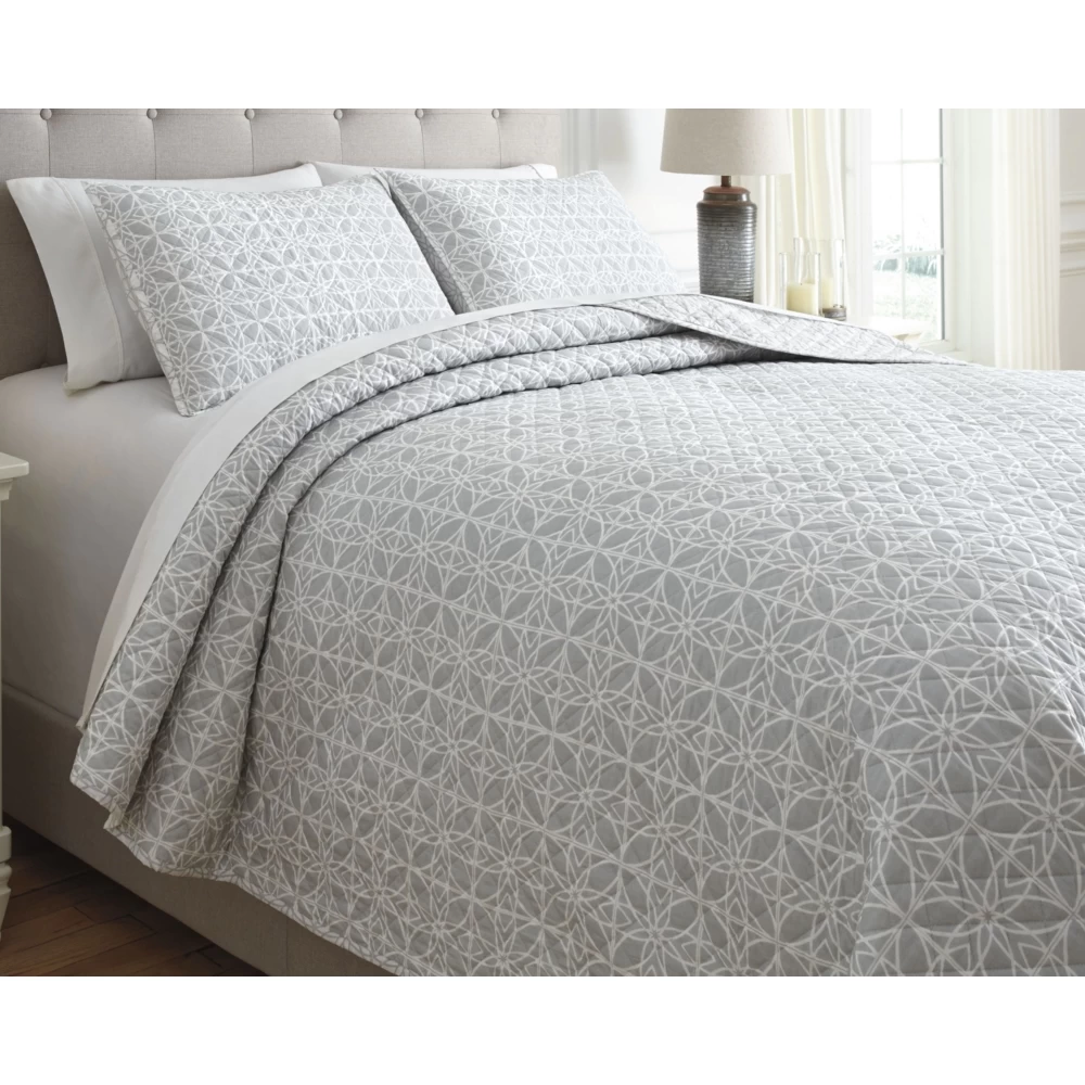 Give your bed a cohesive look with the Mayda 3-piece king quilt comforter set. The comforter and 2 pillow shams in cotton fabric with gray and white percale weave are reversible for easy style switch-up.