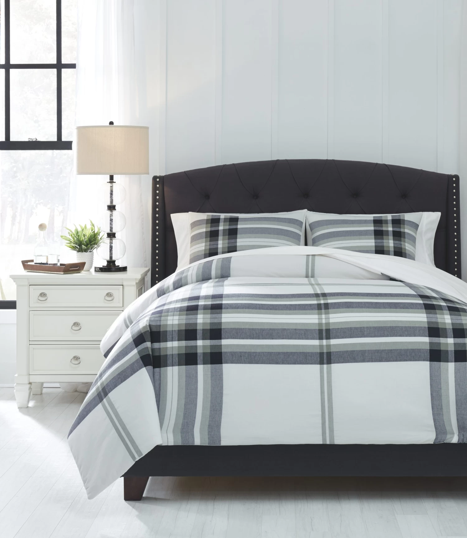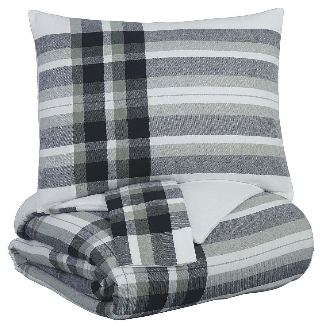 3-Piece Comforter Set – Includes Comforter and 2 Shams. Large Plaid Design in Black, Gray and White. Cotton Cover with Polyester Filling. Machine Washable.