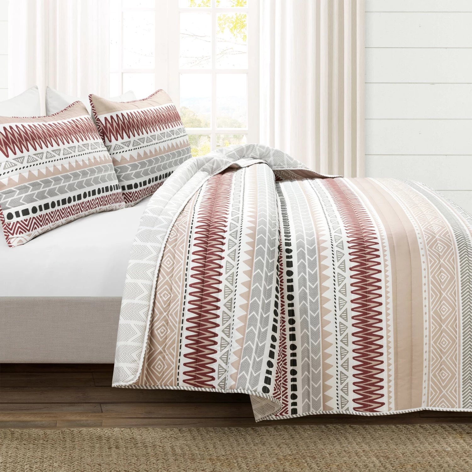Bring warm and rustic southwest style to your bedroom with this STANDARD 100 by OEKO-TEX® certified quilt set. Each piece is painted with Aztec inspired geometric stripes. The reverse of this 3-piece set features a pinstriped arrow design.