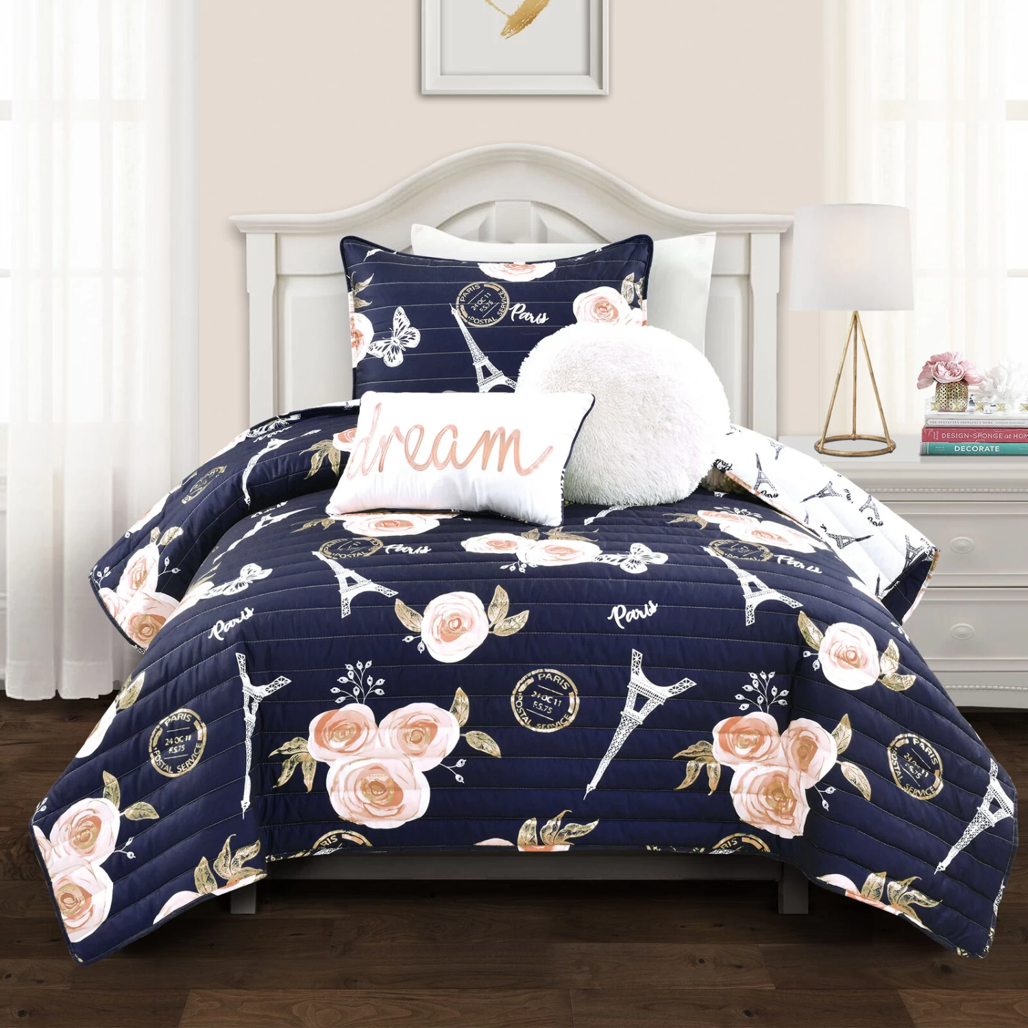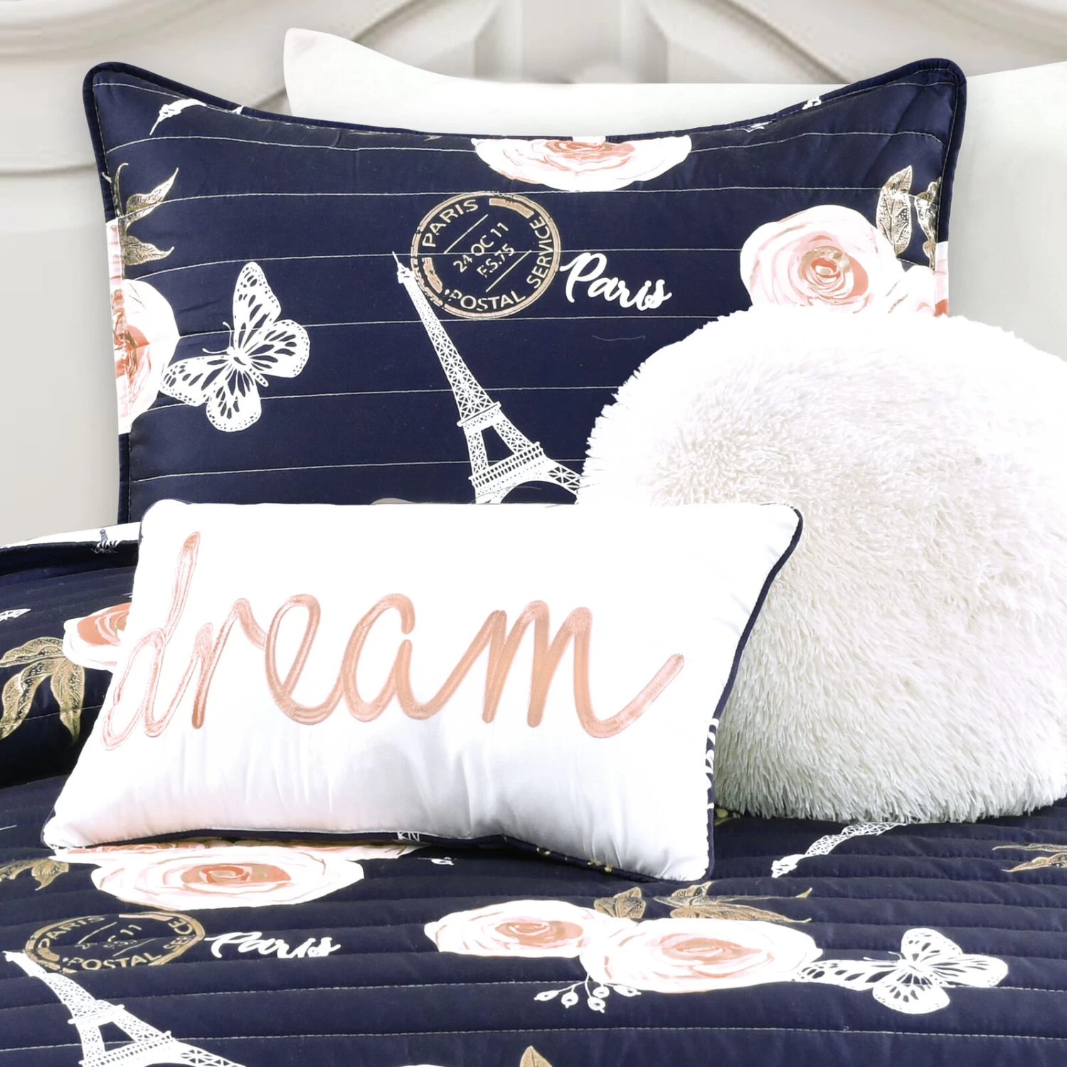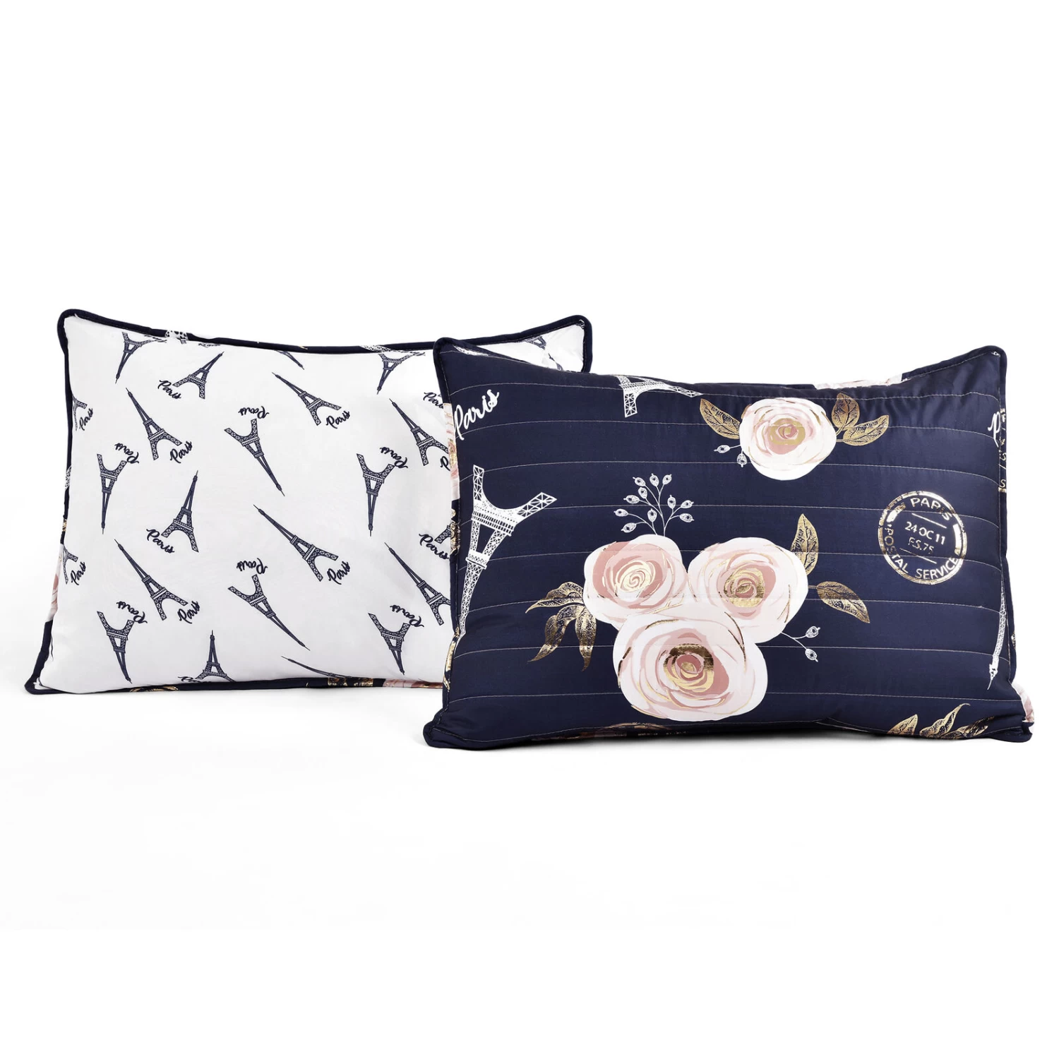 You will love this soft reversible quilt set featuring a unique and elegant pattern of roses, butterflies and Eiffel Towers with the word Paris in script font. The beautiful vintage look with modern metallic printing detail will take your breath away.
